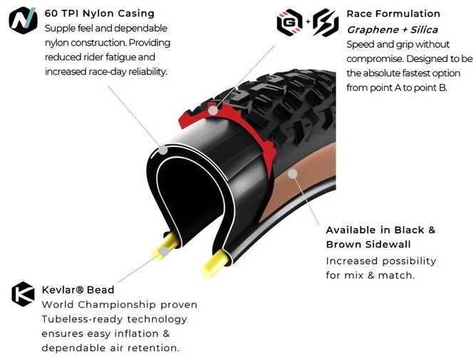 Mezcal and Peyote debuted the new race casing in 2024, featuring wider nylon threads at 60tpi with a supple feel, offering reduced rider fatigue and increased race-day reliability. This new XC Race construction is capped with our Graphene + Silica Race formulation compound and spans the entire range.
