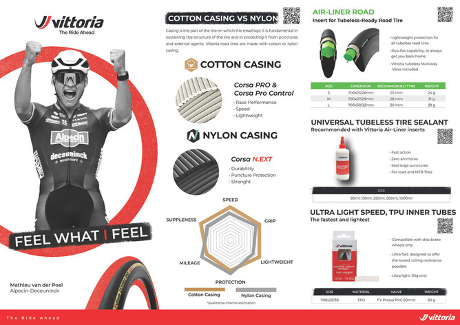 Last but not the least, Corsa PRO in clincher version features a QR Code printed on the tyre hot patch through which it is possible for riders to access useful information about the tyre, such as tutorials, recommended air pressures, recommended tubes and accessories, as well as the location of the nearest Vittoria dealer.