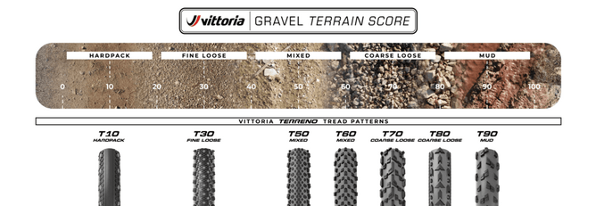 From fast hardpack to deep mud, Vittoria's Terrain Score makes it easy: 7 tread patterns, from T10 to T90, each designed to match a specific surface.